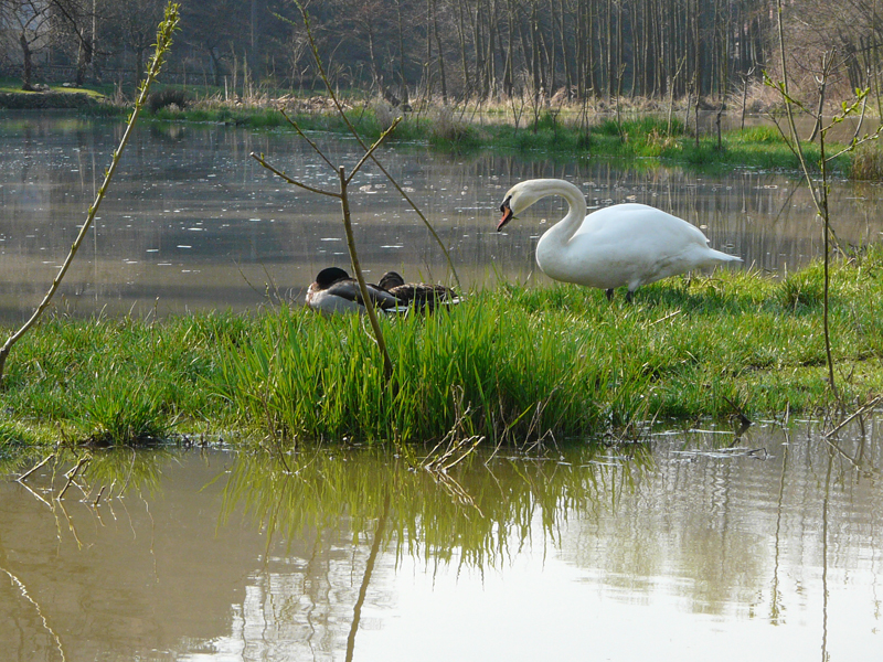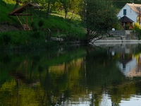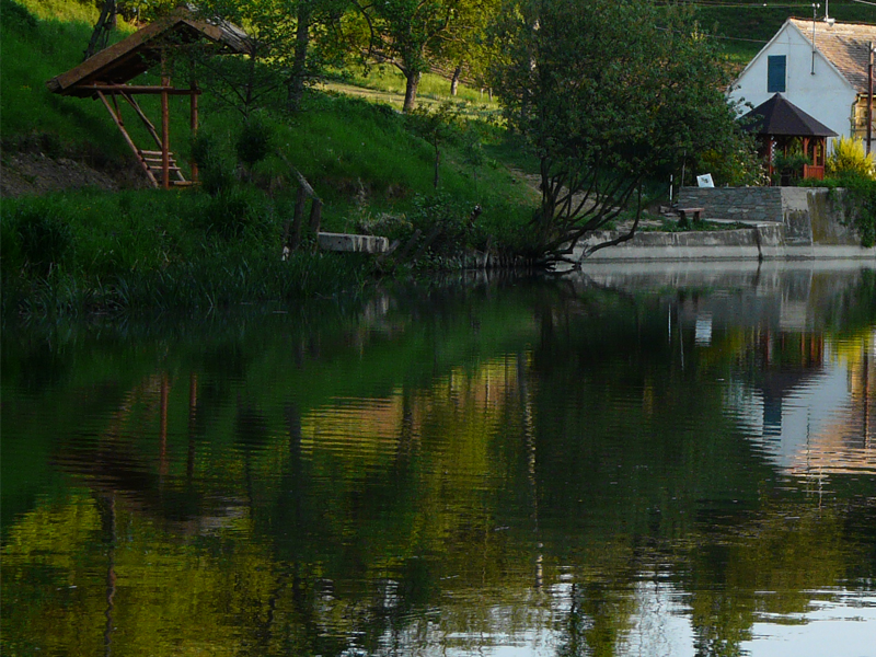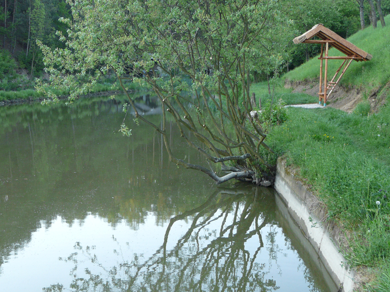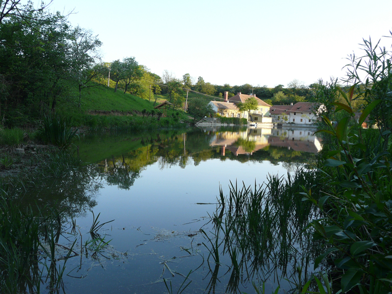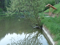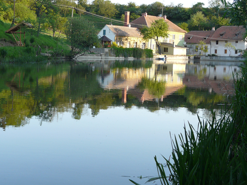 Penzion přímo sousedí s rybníkem.
